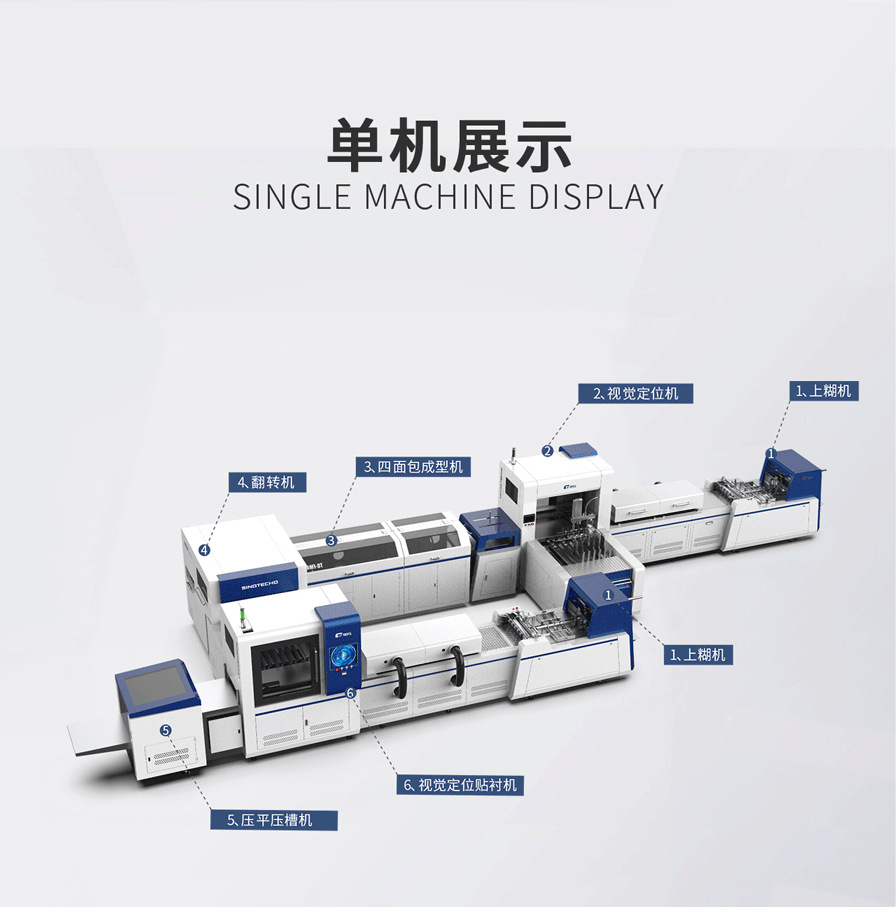 智能皮壳一体机是我司针对高端精品烟、酒盒包装领域开发的制盒专用产线。该产线可实现送面纸不间断上料、面纸过胶,灰板上料,面纸与灰板自动视觉定位粘合、皮壳四面包成型、皮壳在线翻转、衬纸上料、衬纸过胶、皮壳衬纸在线粘合成型、在线压平压槽、收料等工艺连线操作,生产流程全自动化。线体布局合理,占地面积小,皮壳机与裱衬机通过翻转机相连,操作人员精减2人,生产效率大幅提升。我司针对此线,已申请多项专利,拥有完整的专利保护链。